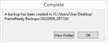 "A backup has been created in /C:/Users/User/Desktop/FrameReady Backups/20220909_091726"