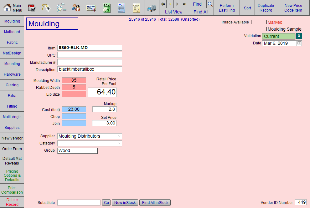 Tip: If you override the description with the text "not verified", then said message appears in red type when the item is added to a Work Order. Useful in reminding staff to avoid using a specific moulding or matboard.