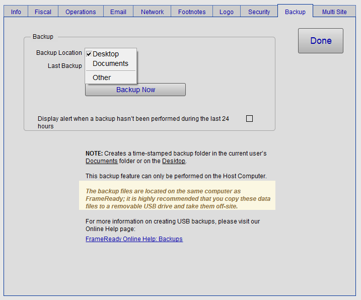 Single Computer setups use the manual "Backup Now" feature in FrameReady.