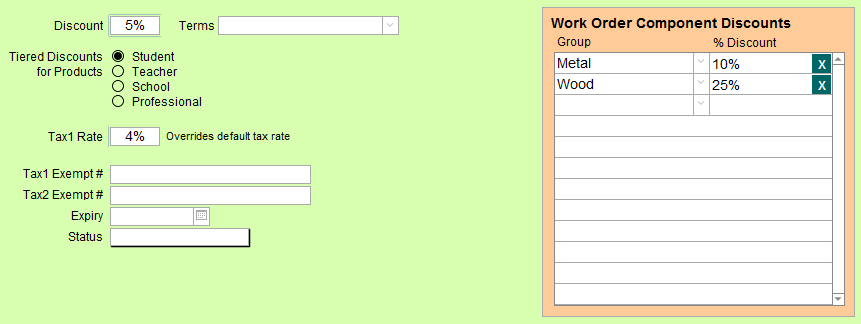 Discount is used to record a % discount given to the customer and is applied to all Work Orders and/or Invoices.