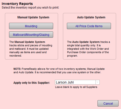 Knowing what you have in stock isn’t enough. Use the above report in conjunction with the best selling moulding report, Moulding and Matboard Usage Report, to see which inventory isn’t moving. Print it for any date range and get the total footage or quantity sold, as well as listing the items actually sold in order of volume. See Printing the Moulding Usage by Supplier Report.