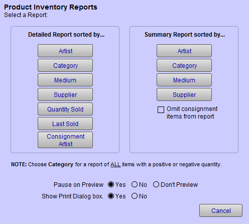 A detailed report of retail products can be printed in seven different sort orders; Artist, Category, Medium, Consignment Artist, Supplier, Quantity Sold and Last Sold.